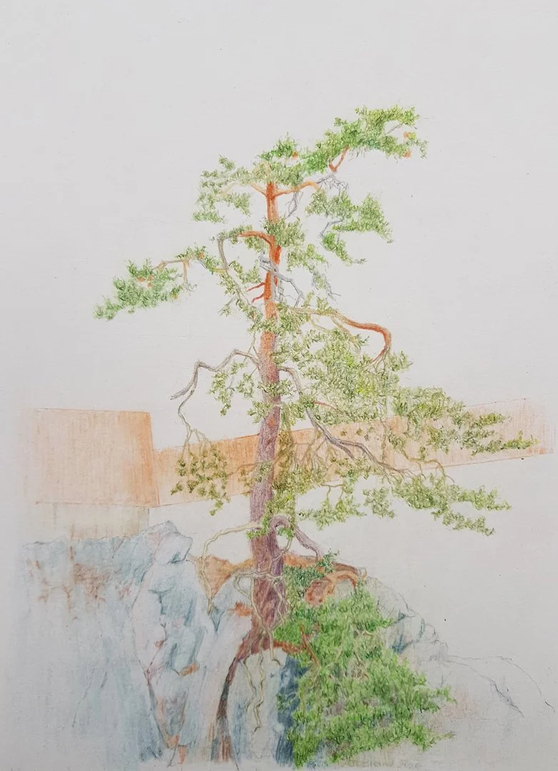 The project also questions what is most important in nature. Is it the straight uniform trees in a commercial wood or the damaged trees that grow despite all the challenges they meet? Which of these two groups will survive climate change? Some of the trees I have drawn are growing on tumuli or in old quarries, man made changes in the ground that are hundreds of years old but still effect plant growth today. Is that a signal we should listen to?