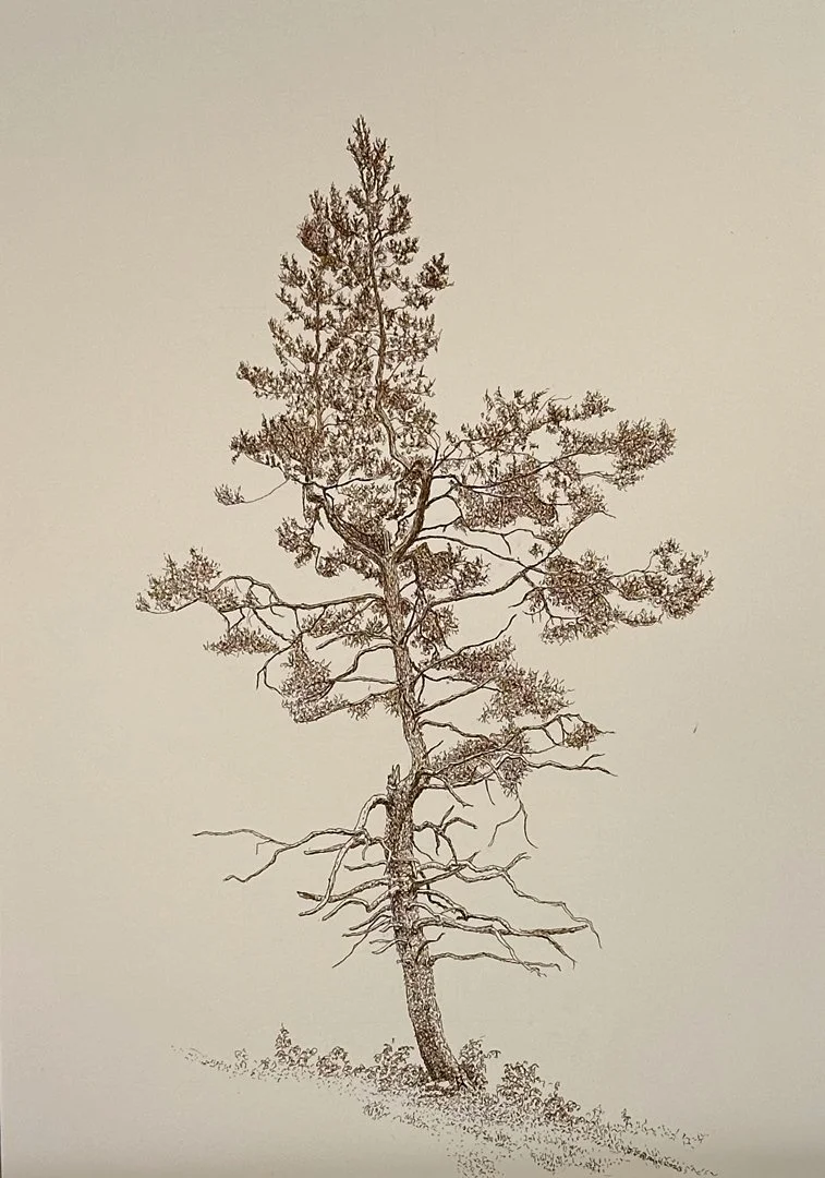 It has taken some time and experimentation to find a presentation form that I like. In the end my choice was sepia ink, pen and paper, tools artists have used for hundreds of years. I believe that old trees deserve to be presented in a dignified way that only well-tried techniques can achieve. Recently I have begun to mix coloured inks myself to see if that can give a new form of expression. A technical challenge has been to separate a tree from its background and foreground, to tease it away from its neighbours when they intertwine, i.e. separate the tree from the wood rather than the wood from the trees.